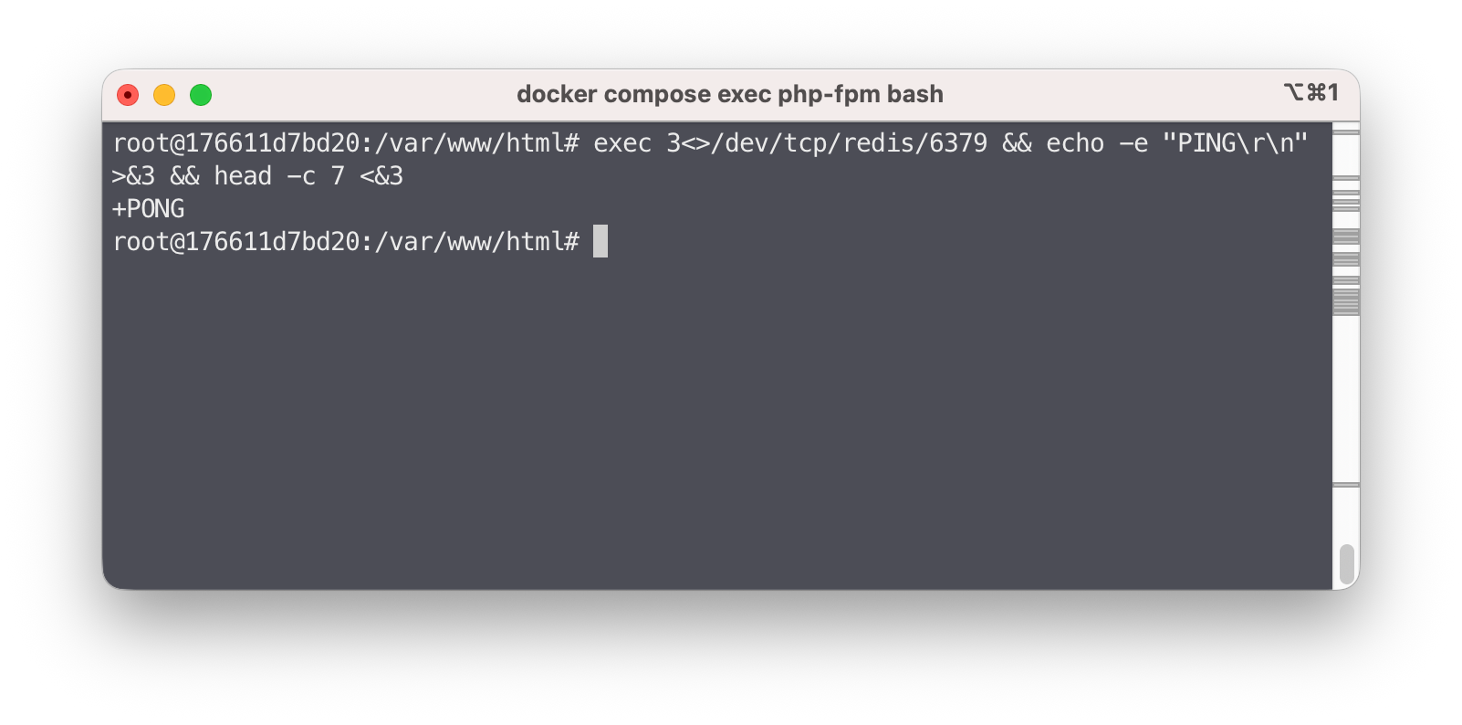 После делаю коннект к контейнеру php-fpm и из него запускаю команду проверки подключения к redis - exec 3<>/dev/tcp/redis/6379 && echo -e "PING\r\n" >&3 && head -c 7 <&3 и вижу ответ +PONG. Значит все успешно отработало и мы имеет сетевую доступность редиса из контейнера с пхп.